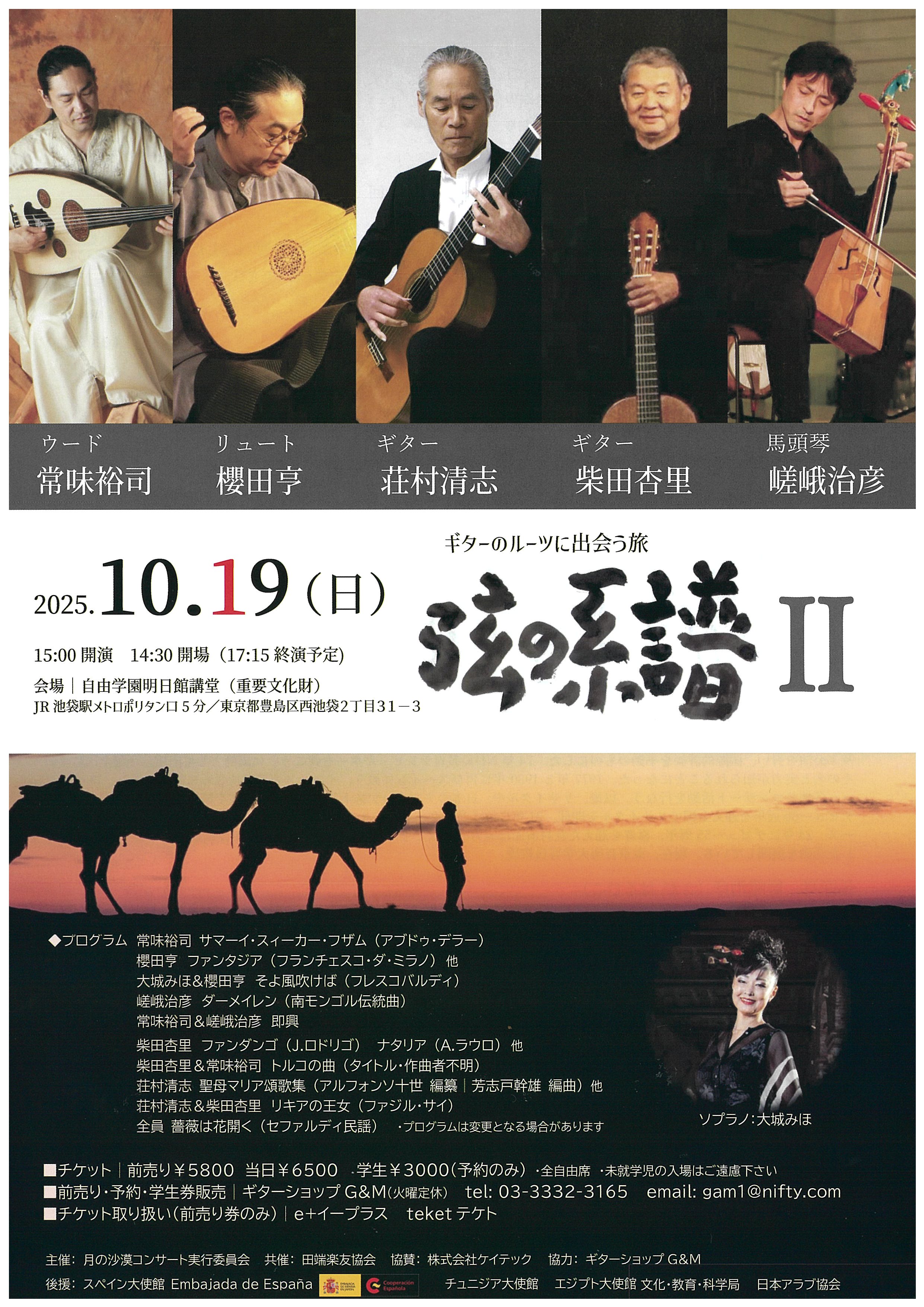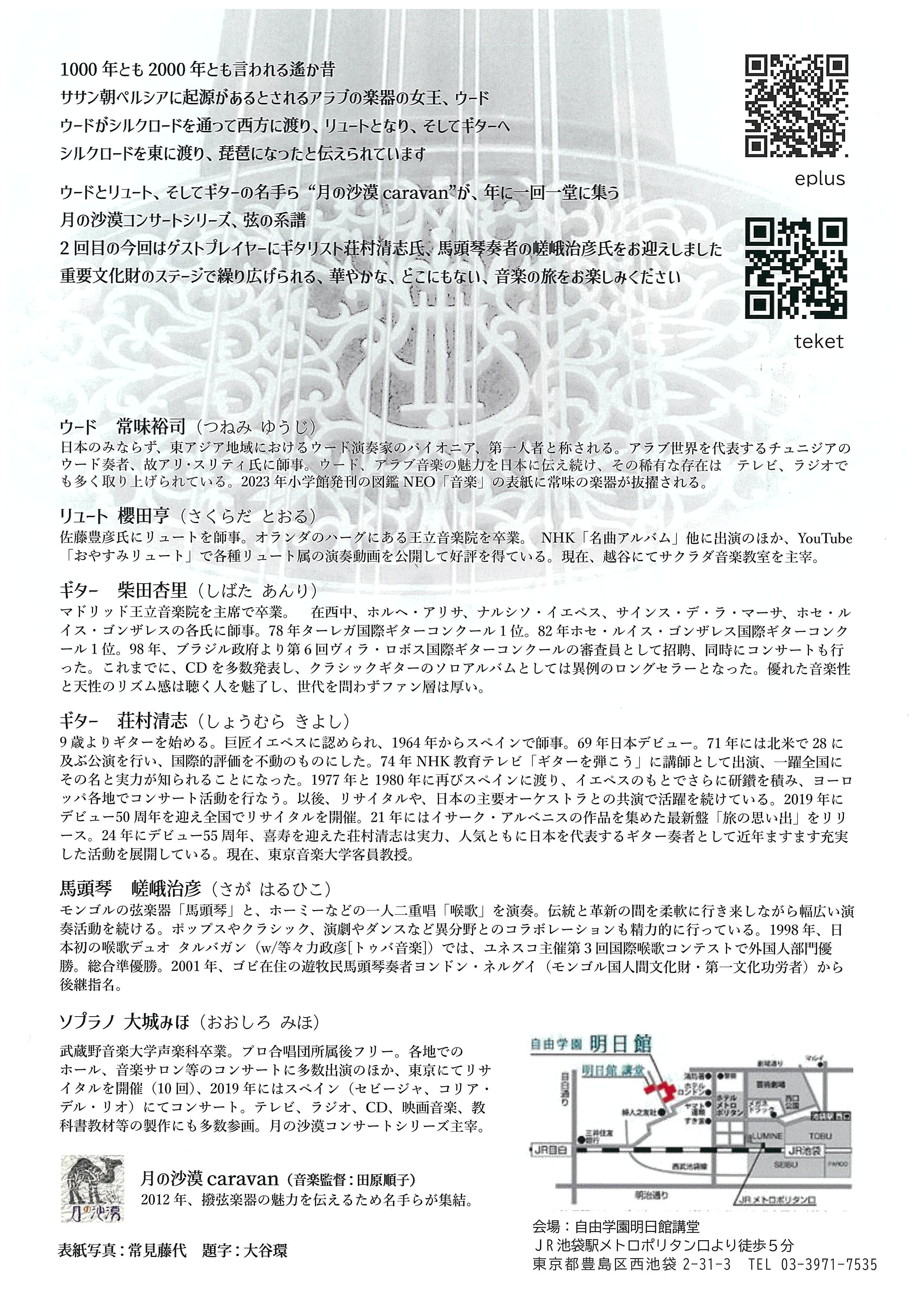 毎年恒例の「月の沙漠コンサート」、今年で第12回を迎えます。今回は昨年に引き続き、「ギターのルーツに出会う旅」をテーマに、「弦の系譜Ⅱ」と題して開催します。会場はいつもと同じ東京・池袋の自由学園明日館(みょうにちかん)です。多くの皆さまのご来場をお待ちしております!